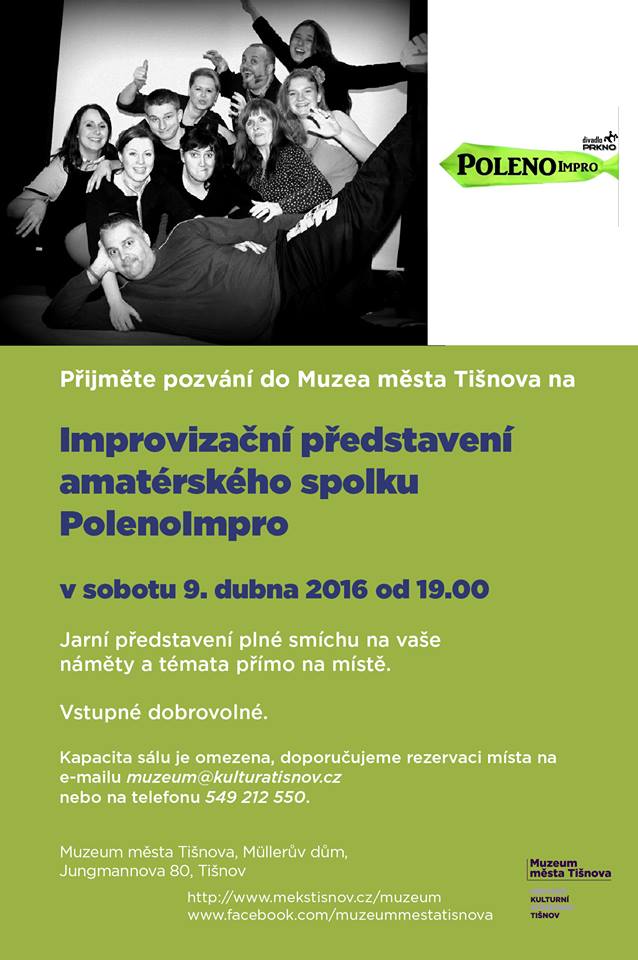 Srdečně zveme na naše představení v sobotu 9. 4. 2016 v 19:00 v Müllerově domě v Tišnově. Na programu imrovizované skeče na témata Vás, diváků. Přijďte se zrelaxovat, pobavit a zasmát. Více také v Přehledu vystoupení. Těšíme se na Vás!
